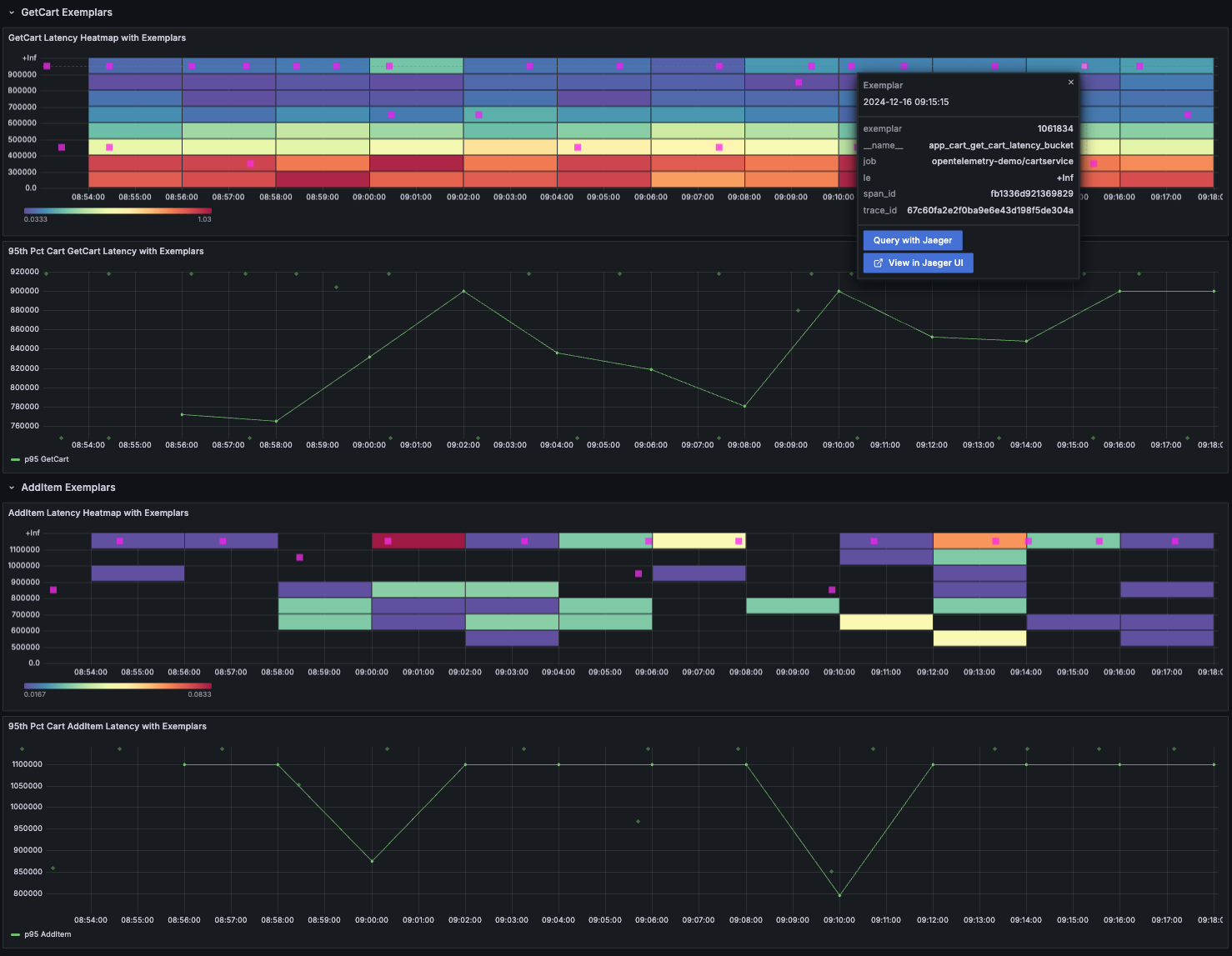 To visualize the Exemplars, navigate to Grafana http://localhost:8080/grafana > Dashboards > Demo > Cart Service Exemplars.